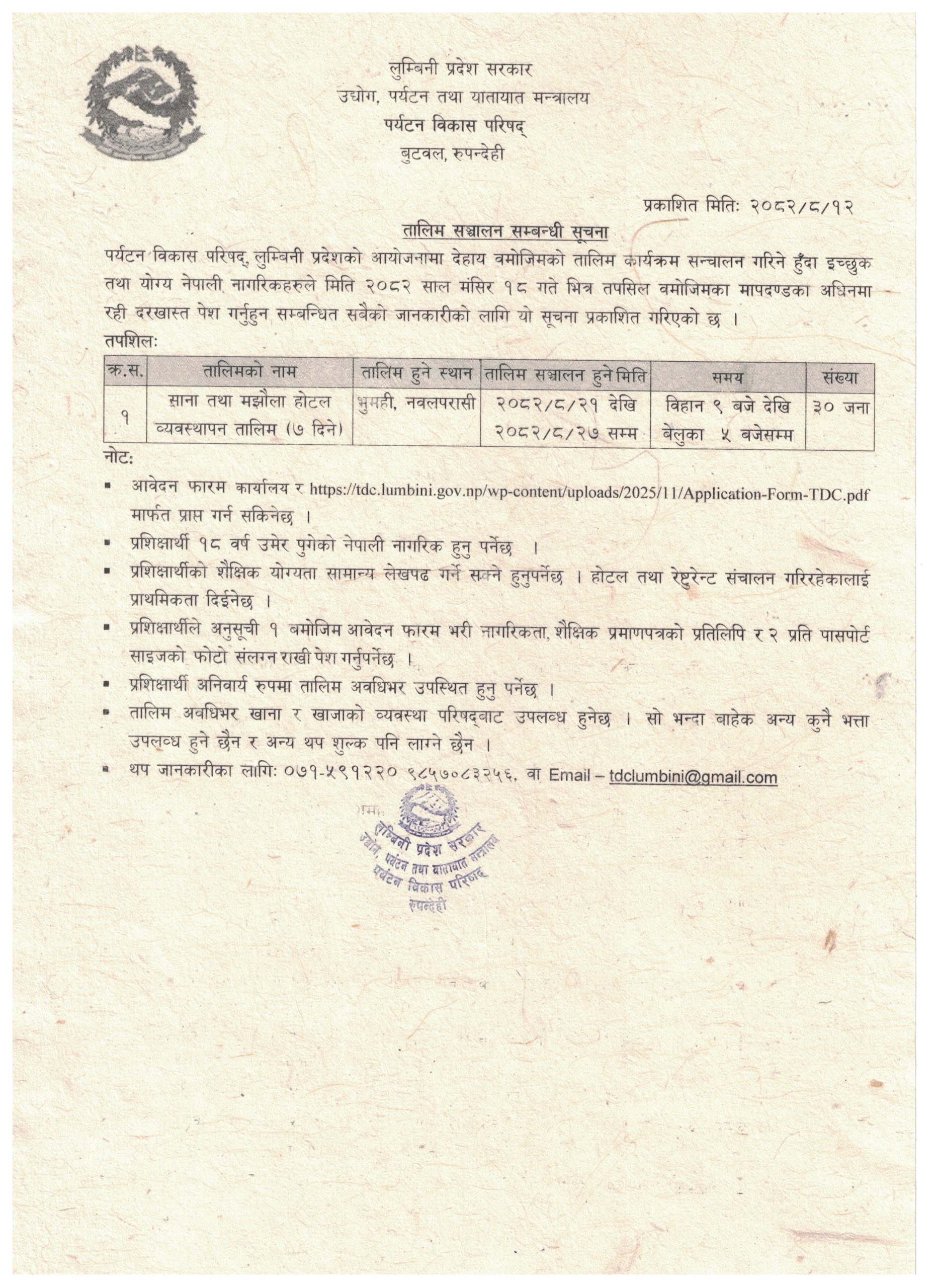होटल व्यवस्थापन तालिम सञ्चालन सम्बन्धी सूचना